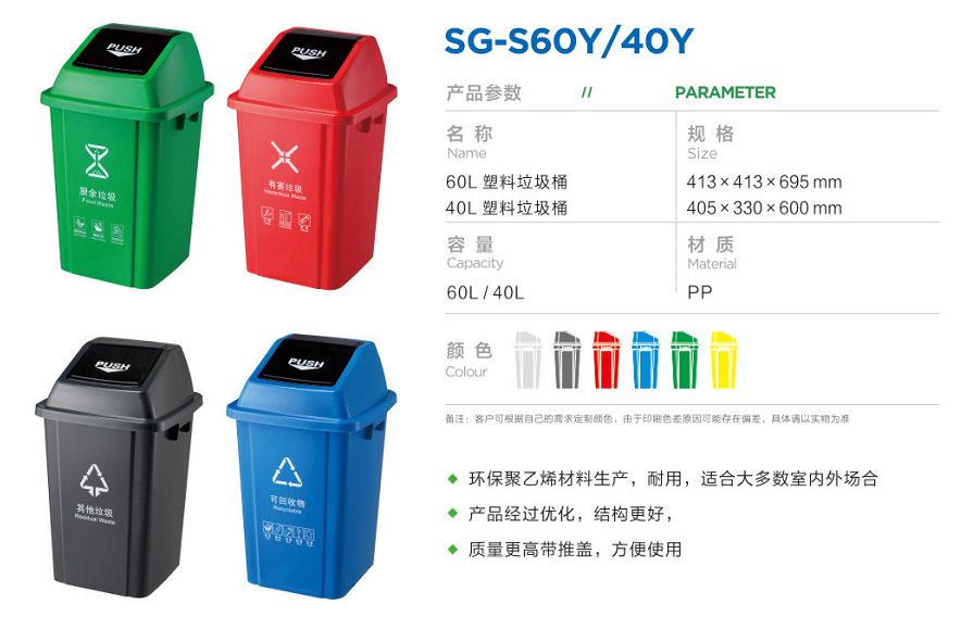 菜單産品中心Product center 塑料垃圾桶 垃圾分類房 垃圾分類亭 智能(néng)回收箱 多分類垃圾桶 不鏽鋼果皮箱 鋼木果皮箱 有害垃圾箱 室内垃圾桶 花箱/公園椅 人力保潔車 新能(néng)源環衛車 噴塑加工 钣金加工 熱門産品 →噴塑加工 →外殼钣金加工 →SG-S240G-标準款 您的位置:首頁 → 公司産品 → 塑料垃圾桶 → SG-S60Y/40Y SG-S60Y/40Y類别:塑料垃圾桶 簡介:公司專業生産“蘇冠”、“ 智尚彙”品牌的各種塑料垃圾桶、智能(néng)回收箱、智能(néng)清潔小屋、(不鏽鋼、金屬、鋼木、玻璃鋼、石材)垃圾桶、垃圾屋、果殼箱、清潔車、移動廁所、戶外休閑椅、廣告牌等系列産品。産品廣泛應用于生活小區、公共場所、園林綠化、賓館、醫院等場所。采用國際标準的原材料進行生産,産品具有美觀、耐用、防腐、環保等優點,對改善生活環境和工作起(qǐ)到一定的推動作用。 在線咨詢 返回列表 産品說明 相關産品 SG-S12L/10L SG-S12L/10L SG-S15L/14L/8L SG-S15D SG-S20F/16F SG-S25T