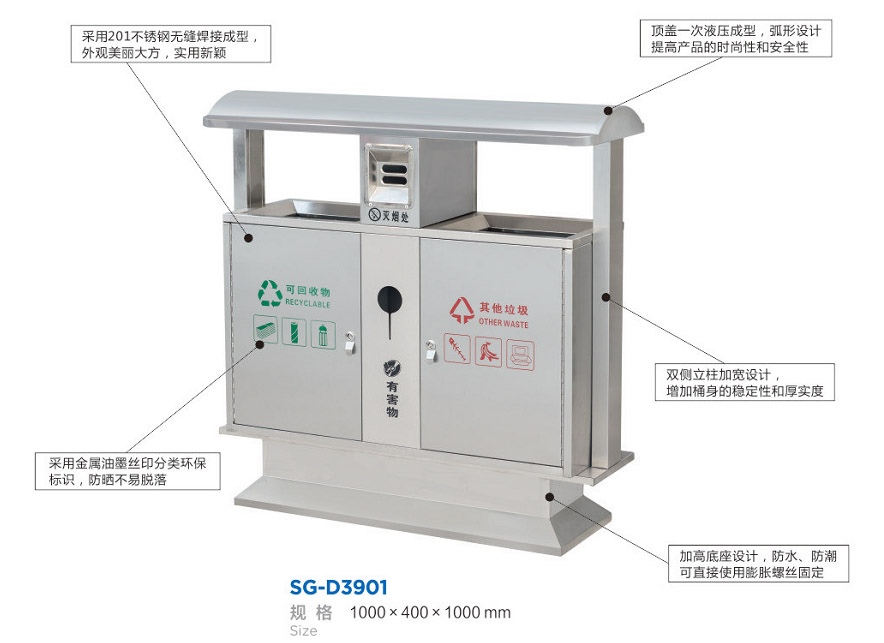 菜單産品中心Product center 塑料垃圾桶 垃圾分類房 垃圾分類亭 智能(néng)回收箱 多分類垃圾桶 不鏽鋼果皮箱 鋼木果皮箱 有害垃圾箱 室内垃圾桶 花箱/公園椅 人力保潔車 新能(néng)源環衛車 噴塑加工 钣金加工 熱門産品 →噴塑加工 →外殼钣金加工 →SG-S240G-标準款 您的位置:首頁 → 公司産品 → 不鏽鋼果皮箱 → SG-D3901 SG-D3901類别:不鏽鋼果皮箱 簡介:公司專業生産“蘇冠”、“ 智尚彙”品牌的各種塑料垃圾桶、智能(néng)回收箱、智能(néng)清潔小屋、(不鏽鋼、金屬、鋼木、玻璃鋼、石材)垃圾桶、垃圾屋、果殼箱、清潔車、移動廁所、戶外休閑椅、廣告牌等系列産品。産品廣泛應用于生活小區、公共場所、園林綠化、賓館、醫院等場所。采用國際标準的原材料進行生産,産品具有美觀、耐用、防腐、環保等優點,對改善生活環境和工作起(qǐ)到一定的推動作用。 在線咨詢 返回列表 産品說明 相關産品 SG-D4203 SG-D4202 SG-D4201 SG-D4102 SG-D4101 SG-D4004